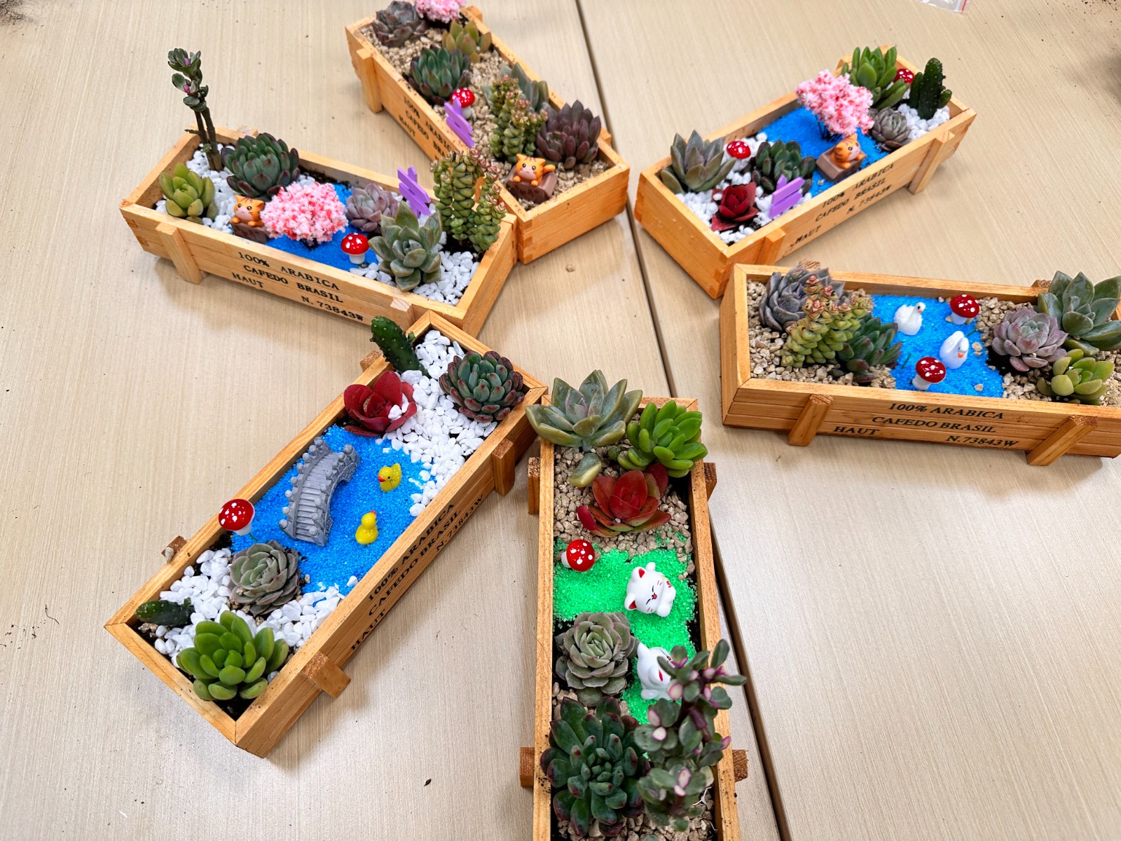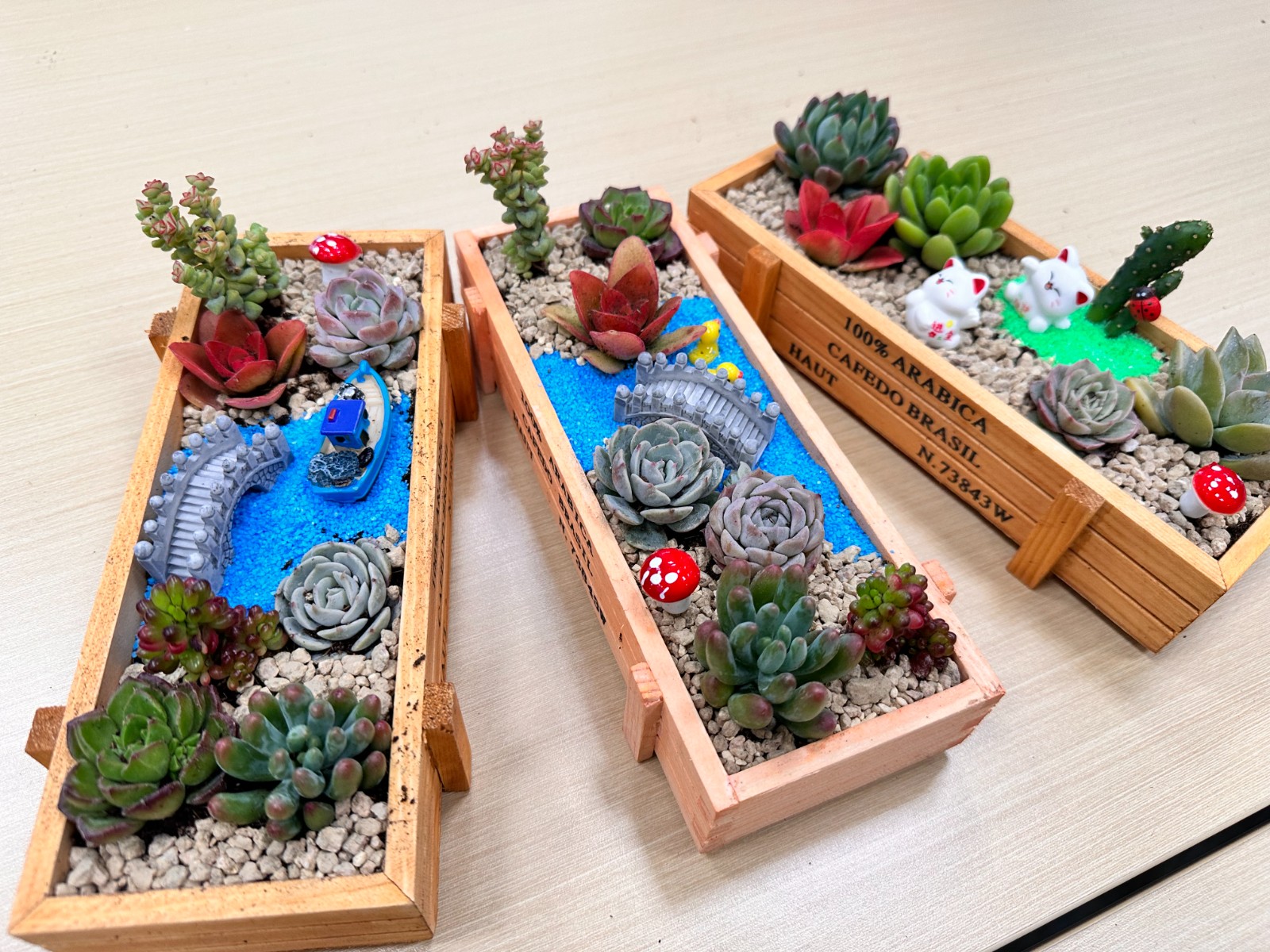 在創作過程中,大家發揮天馬行空的想象力,將彩色石子、萌趣擺件與多肉植物巧妙結合,打造出一個個充滿生機與個性的“迷你花園”。這些作品不僅展現了女性獨特的審美與創造力,更成為了一份獨一無二的心靈治愈。