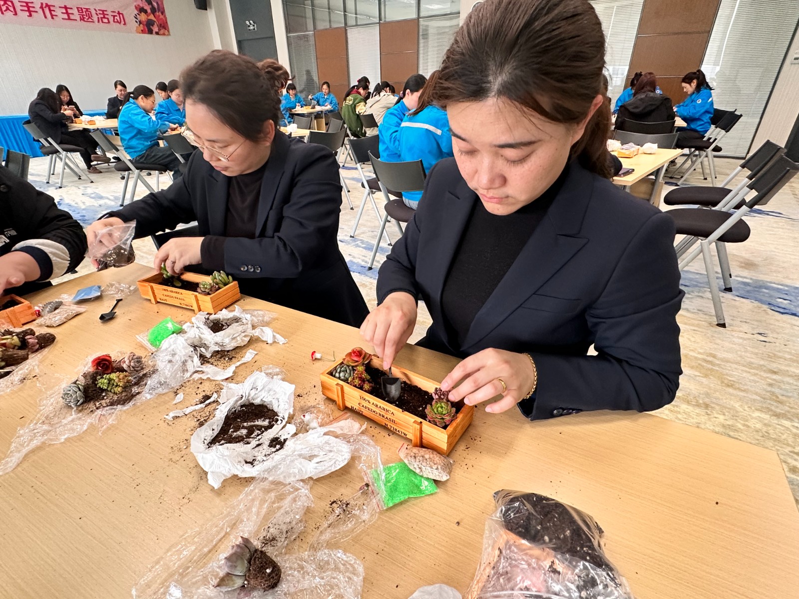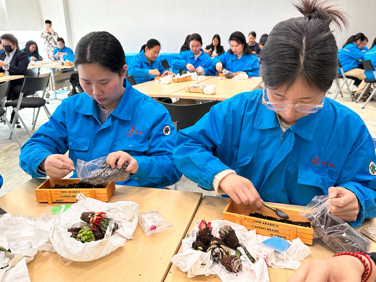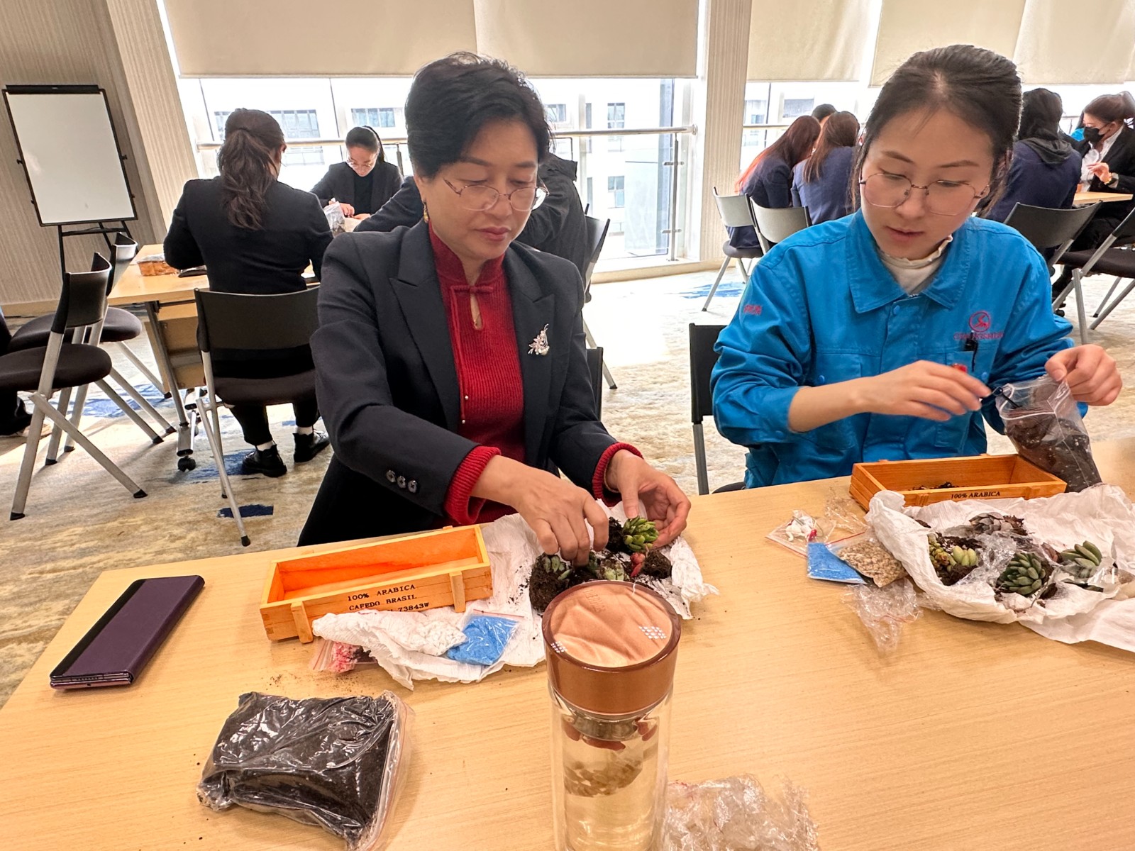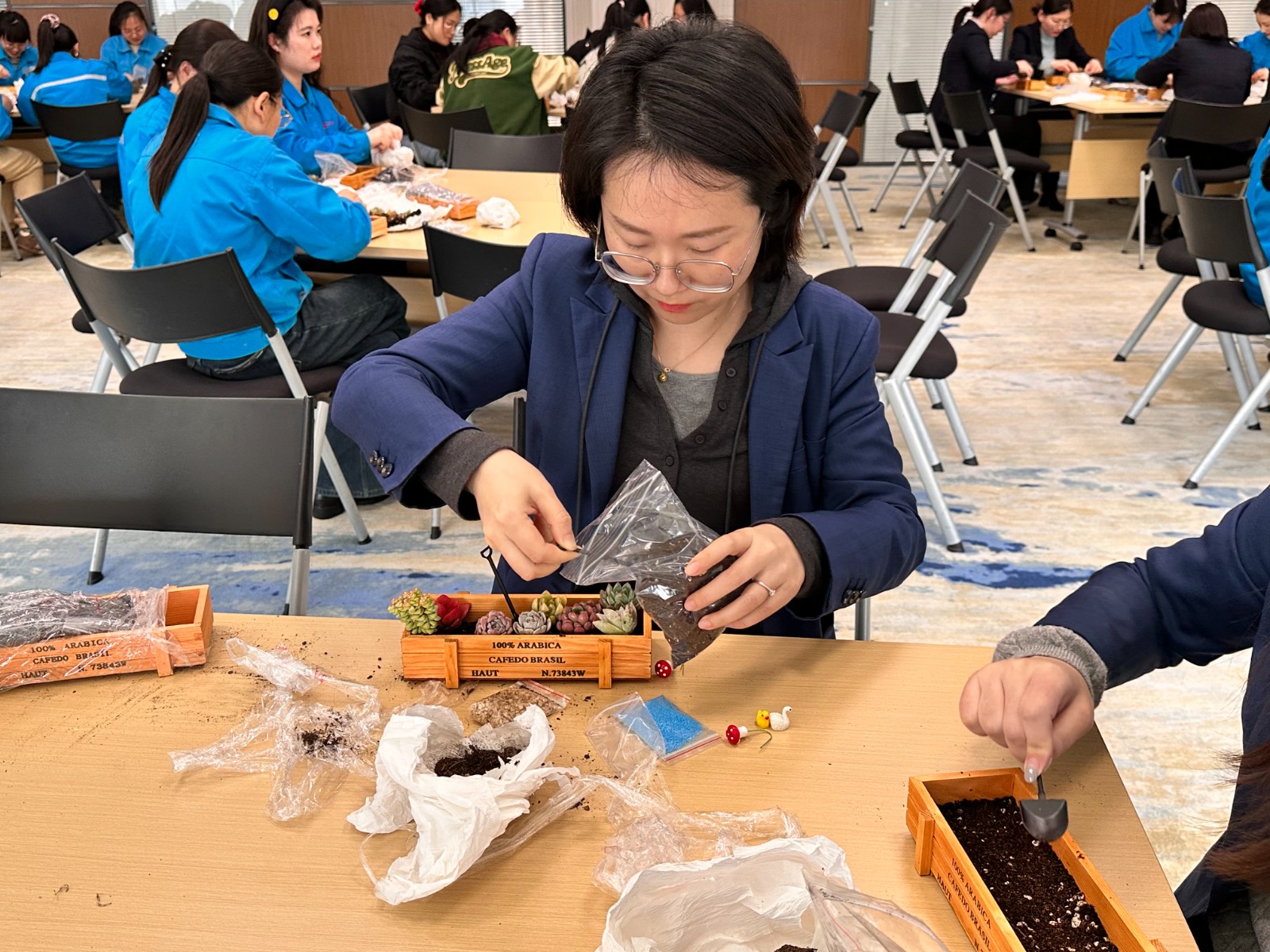 活動現場,集團502會議室搖身一變,成為了一片生機勃勃的綠意天地。在專業老師的指導下,大家化身園藝小達人,從挑選心儀的多肉品種到巧妙搭配色彩與造型,再到親手將這些“小可愛”栽種進精致的花盆,每一道工序都充滿了創意與樂趣。