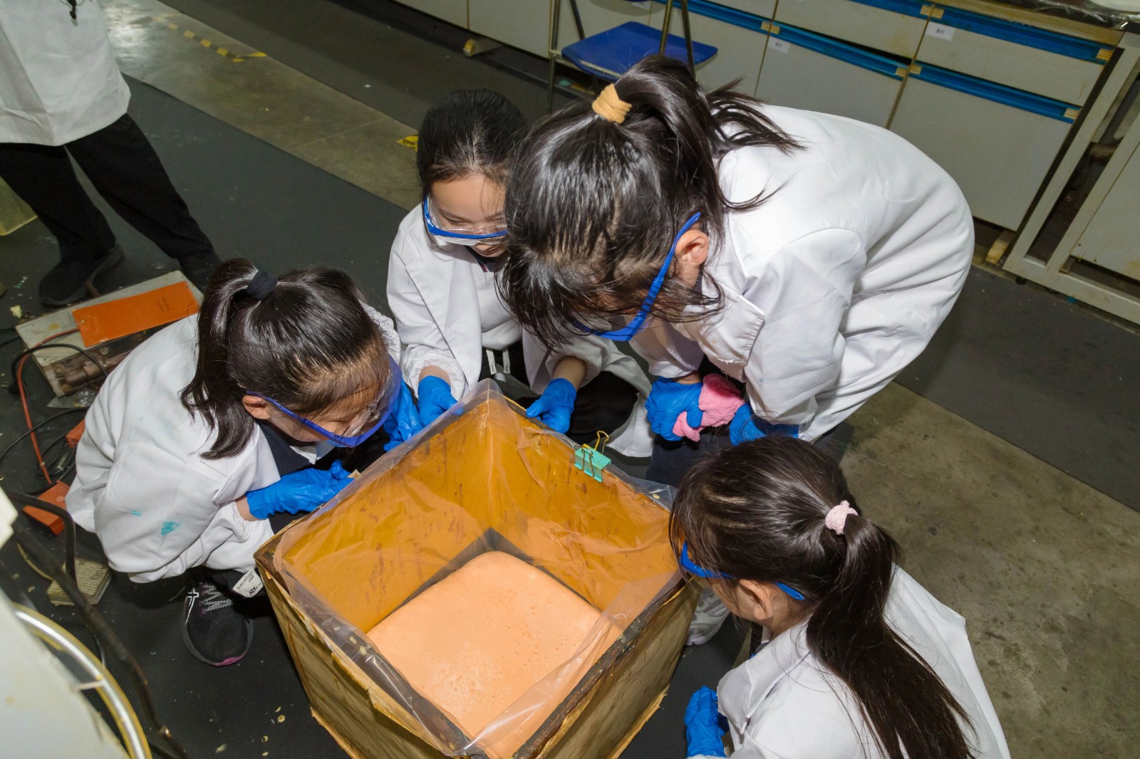 在高分子發泡實驗中,學生以毫克級精密配比原料,觀察溶液膨脹固化全過程,制作彈性海綿樣品。實驗環節強調試錯與優化,技術團隊現場解答學生們提出的問題,傳遞科研嚴謹性與創新性。