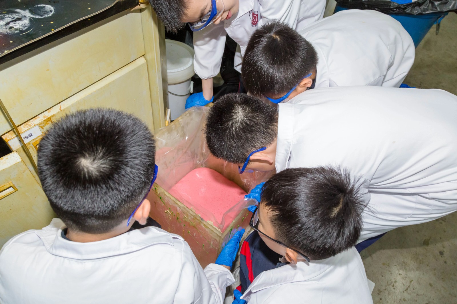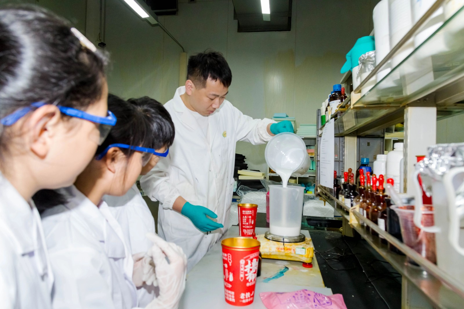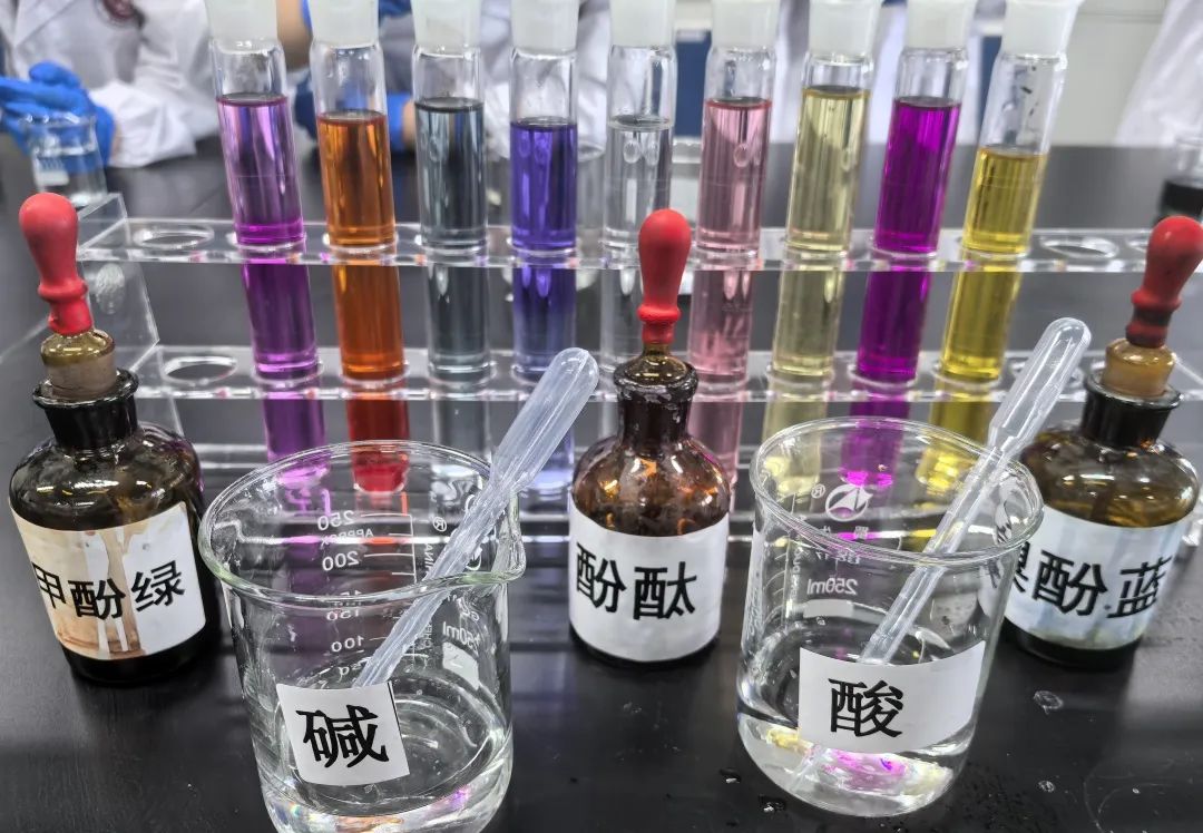 課程聚焦化學基礎與材料科學,設置“酸堿指示劑變色實驗”與“高分子發泡實驗”兩大實踐模塊。在技術老師指導下,學生學生通過溴甲酚綠、酚酞等試劑的酸堿反應實驗,掌握pH值變化規律,并親手調制個性化彩色溶液;
